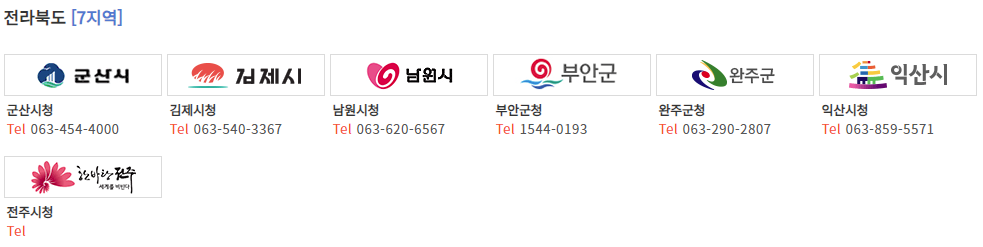- 전라북도 (군산시, 김제시, 남원시, 부안군, 완주군, 익산시, 전주시)