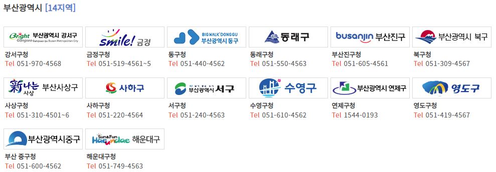 - 부산광역시 (강서구, 금정구, 동구, 동래구, 부산진구, 북구, 사상구, 사하구, 서구, 수영구, 연제구, 영도구, 중구, 해운대구)