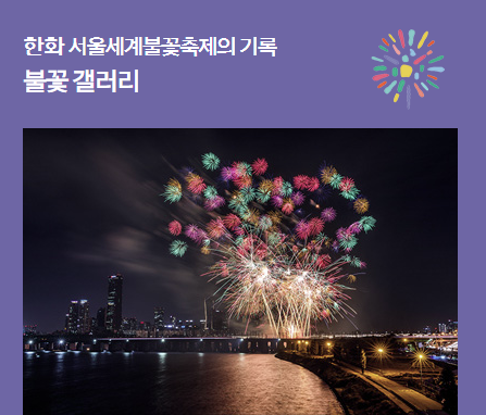 서울 불꽃축제는 한화그룹이 매일 바쁜 삶을 사는 시민 일상에 즐거움을 주기 위해 2000년부터 시작하여 사회공헌 사업으로 진행해온 우리나라 최고의 축제 입니다. 매년 세계적인 불꽃 전문 기업들이 초대되어 환상적인 불꽃을 연출하고 있고 주간에도 많은 부대행사가 진행됩니다. 올해는 중국과 폴란드가 참여하며, 외국인 관람객 대상으로 서울 관광상품 다각화를 위해 유료관람석을 운영할 예정이며, 불꽃쇼와 함께 DJ공연, 미디어쇼 등 많은 문화행사도 진행됩니다.
