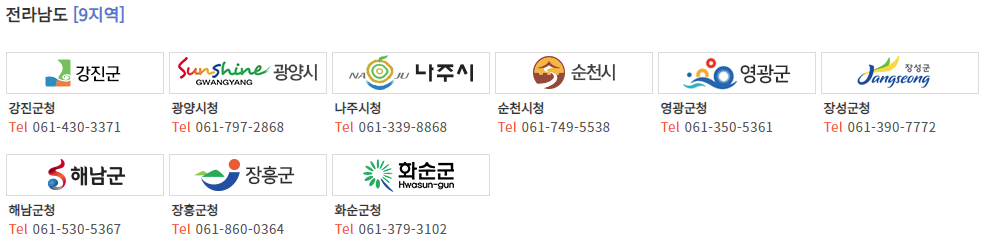 - 전라남도 (강진군, 광양시, 나주시, 순천시, 영광군, 장성군, 해남군, 장흥군, 화순군)