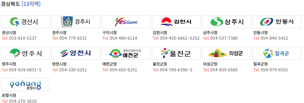 - 경상북도 (경산시, 경주시, 구미시, 김천시, 상주시, 안동시, 영주시, 영천시, 예천군, 울진군, 의성군, 칠곡군, 포항시)